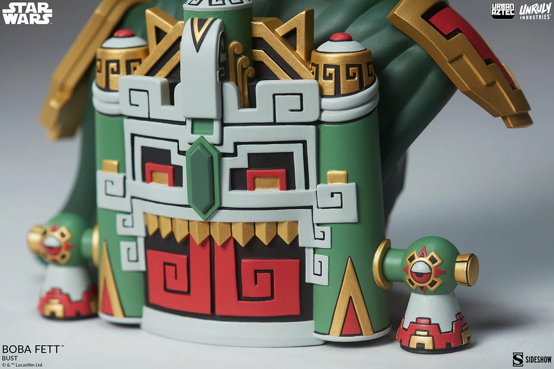 No disintegrations, all dynamite. Urban Aztec infiltrates a galaxy far, far away with the Boba Fett⢠Bust by artist Jesse Hernandez, blending Mayan and Mandalorian influences into badass bounty hunter.