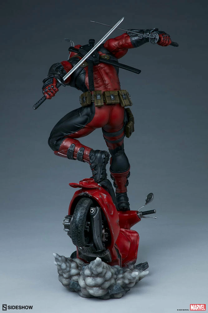 Coming in hot! The Deadpool Premium Format™ Figure measures 20.5” tall as Wade Wilson makes his epic entrance on a crashing red scooter, kicking up a cloud of smoke behind him. Deadpool comes brandishing his signature katanas, but also includes a pair of swap-out hands with fistfuls-o-utensils, just in case the Merc with a Mouth needs to knife, fork with, or even spoon the baddies.