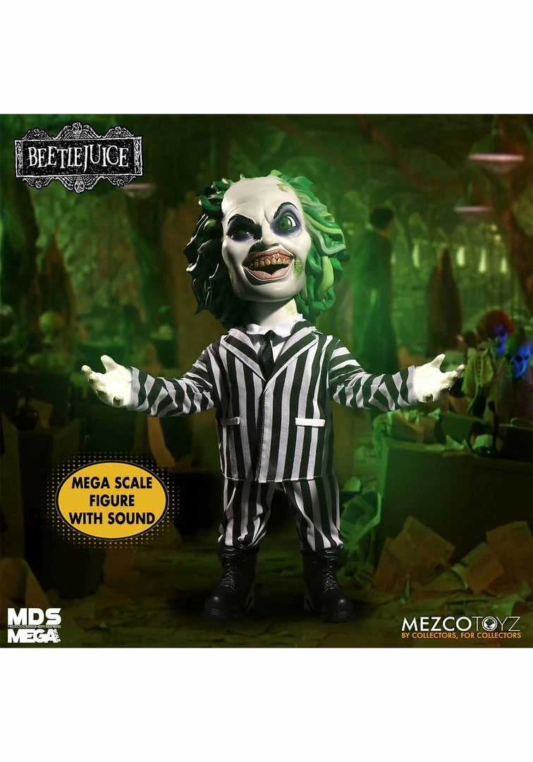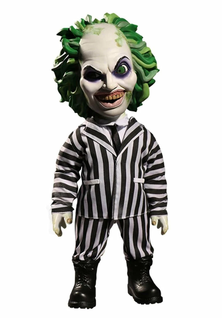 This talking Beetlejuice doll from Mezco embraces Betelgeuse’s gritty, grotesque, and weirdly charming personality. Standing 15 inches tall, the figure has a highly animated and detailed face with wild green hair, a grizzled, greenish grin, and an expression that’s fifty-percent mischief and fifty-percent madness. Press the button on his back back and hear him say seven phrases from the film such as, “I’m the ghost with the most” and “You gotta say my name three times.”