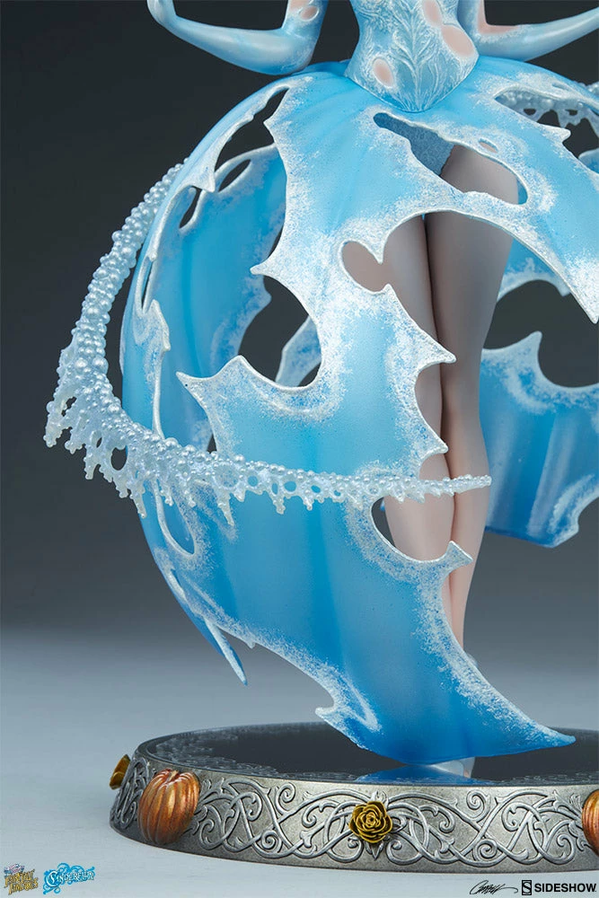 The polyresin Cinderella Statue measures 16.25โ tall atop a silver mirrored base decorated with floral filigree and pumpkin accents, hearkening back to her fairytale origins. Her shimmering blue ballgown magically materializes around her as she prepares to dance with the prince. From her tiara to her iconic slippers, Cinderella looks positively enchanting as envisioned by J. Scott Campbell as a part of this popular pinup series.