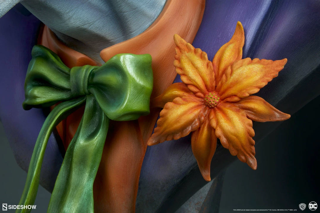 The Joker Life-Size Bust is fully sculpted from the bottom of his bow to the top of his tousled green hair and is painted with vibrant colors befitting the Clown Prince of Crime. The Joker is costumed in a purple suit with an orange dress shirt, a green bow, and an orange lapel flower. His pale, painted skin features highly detailed textures including intense wrinkles and protruding veins, emphasizing the sheer craziness in his signature red smile. Even the gleam of his eyes and his jagged teeth are designed with frightening realism, bringing Batmanās most famous foe to life.