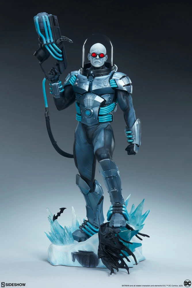 The Mr. Freeze Premium Format™ Figure measures 24” tall on top of a frostbitten laboratory base. As Batman’s below-zero foe, Victor Fries has his cryogenic gun prepared to give the Dark Knight a cold reception. Jagged blue ice crystals protrude upwards from the snowy scene, which features the tatters of a black cape and a batarang below Freeze’s boots.