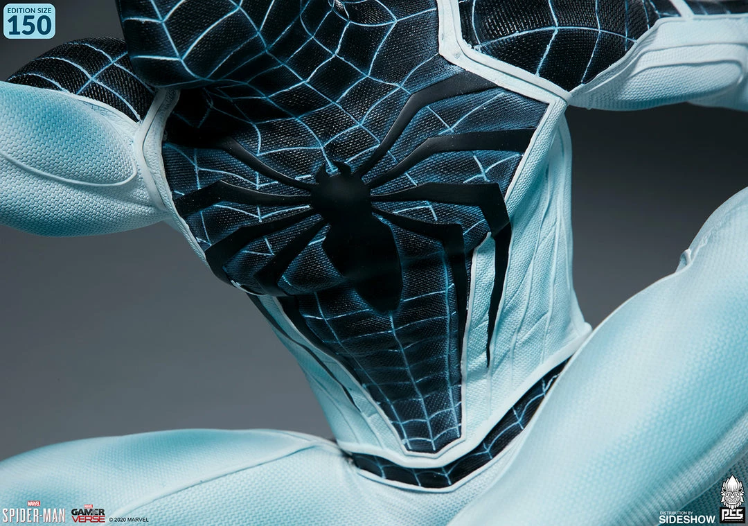 The Spider-Man Negative Zone Suit 1:3 Scale Statue features a fully sculpted costume based on the incredible color negative costume design featured in Marvelโs Spider Man. The Negative Zone Suit features a black and white inverted color scheme, black spider symbols on the chest and back, and unique teal shading throughout in order to recreate the mesmerizing movement of the gameโs negative energy effects. Additionally, the figure features detailed webbed and paneled costume sections, sculpted with realistic textures to further give the appearance of suit fabric.