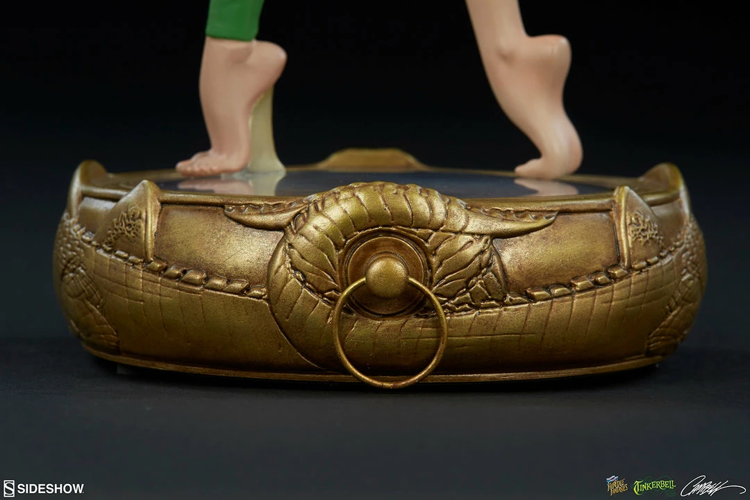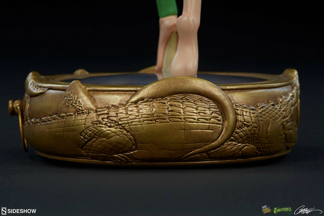 Tinkerbell stands 12β tall, strutting atop an intricate Neverland compass base that points the way to adventure. Detailed twin crocodiles are carved into the golden instrument, which has a realistic face beneath Tinkβs delicate feet.