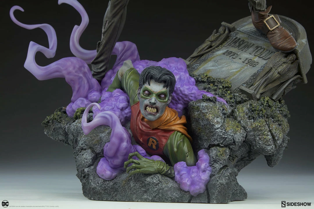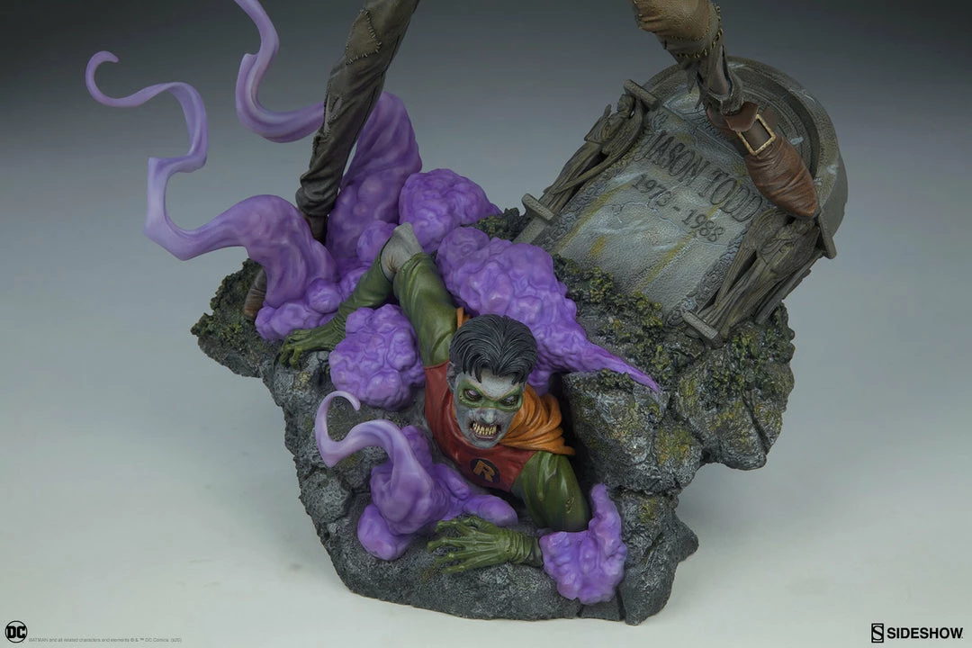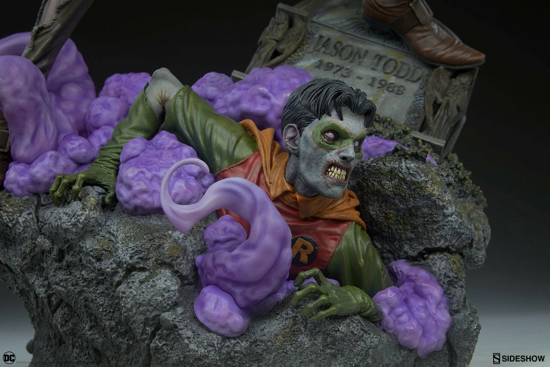 The Scarecrow Premium Format⢠Figure measures 21.5ā tall, looming over a Gotham graveyard base. The haunting figure of Dr. Jonathan Crane stands atop Jason Toddās headstone as the zombified Robin emerges from a purple cloud of fear gas curling from the disturbed earth. Is he real? A hallucination? When faced against Batman, Scarecrow always delivers a true dark nightmare.Ā