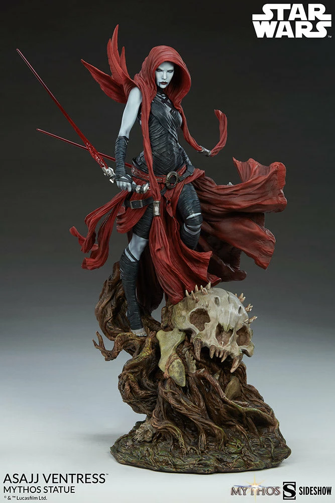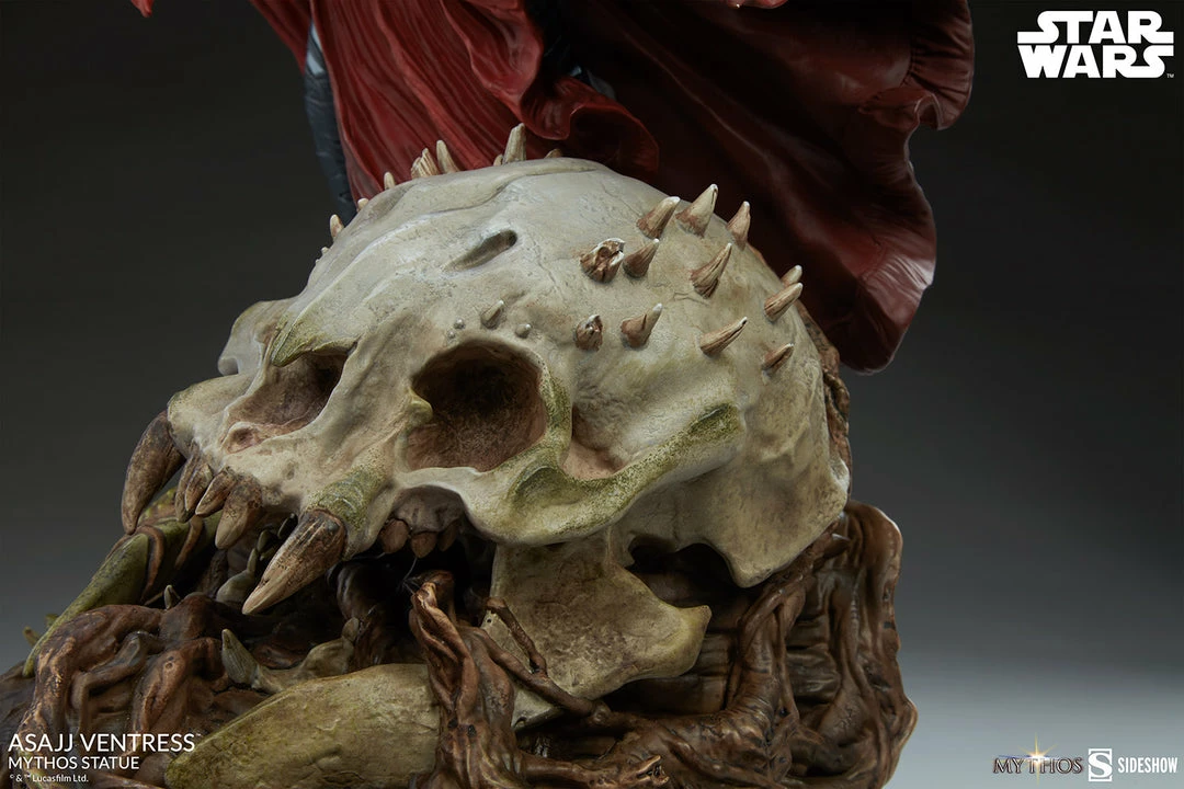 The Asajj Ventress Mythos Statue measures over 22ā tall as the lethal Nightsister stands poised on the growths of a Dathomirian swamp base. Beneath her feet lies a Ssurian skull snared in the vines of her home planetās native flora as the Sith assassin wields her dual red lightsabers in preparation for battle.
