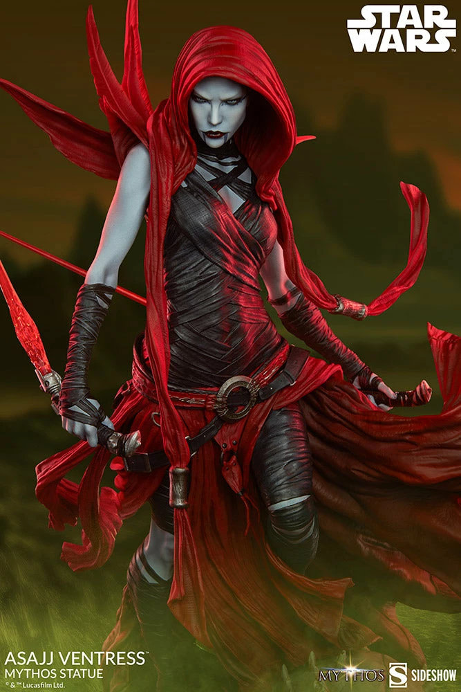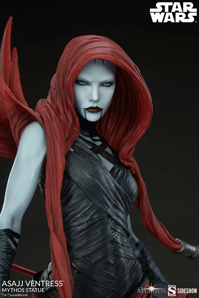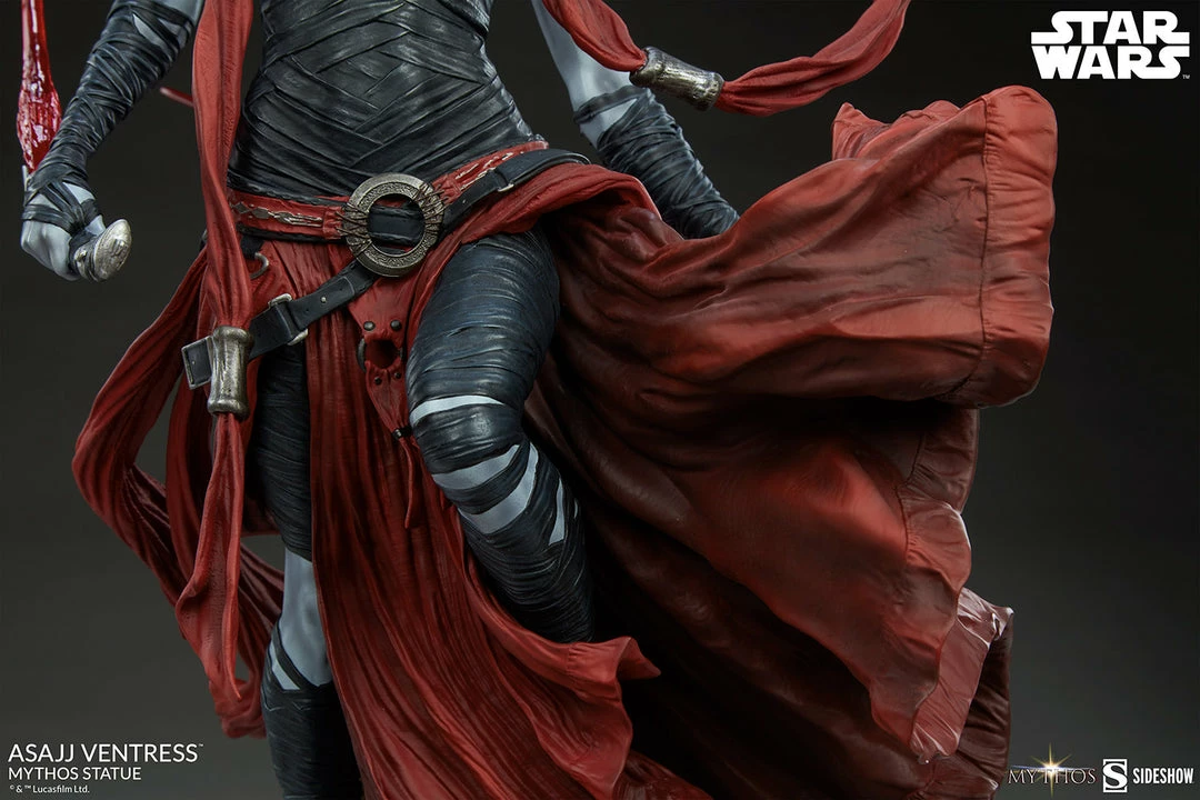 The polystone Asajj Ventress Mythos Statue has PVC elements and features an intricate, fully sculpted costume in the Nightsistersā traditional black and red hues, detailed with realistic and dynamic fabric-like movement. Her black bodice, leg guards, and gloves all have a wrapped and roughened appearance while her red hood, skirts, and the feathers adorning her shoulders are sculpted with dramatic, billowing flow.Ā