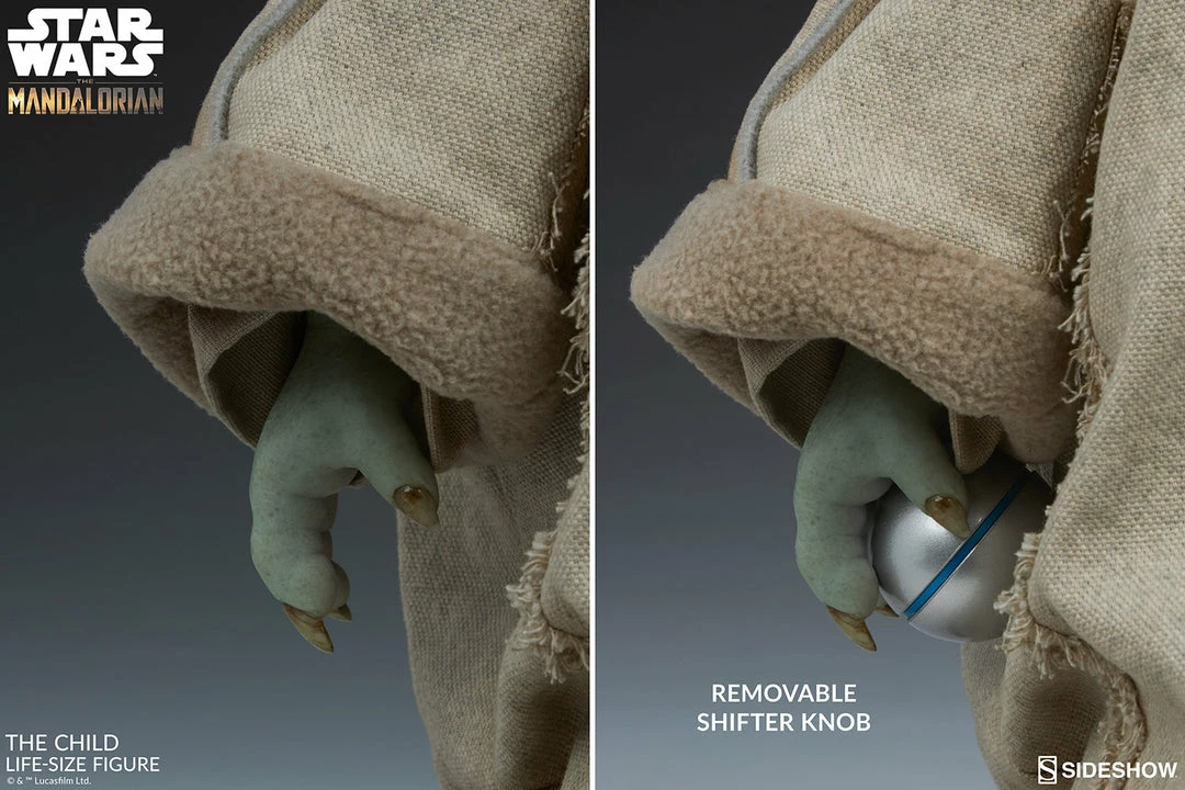 The Child Life-Size Figure measures 16.5β tall, standing on a simple ship deck baseΒ that lets this adorable alien steal all of the focus- along with the Mandalorianβs ship parts. Inspired by its unique onscreen appearance, this mixed media statue features a tan fabric coat swaddling The Child as it gazes up with charming wide eyes, hiding the silver shift knob from the Razor Crestβ’ in its right hand.Β