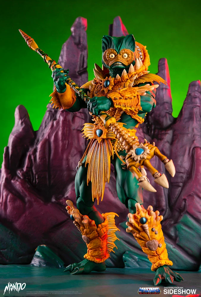By the Power of Grayskull, you too can have the Power! Sideshow and Mondo are proud to bring you the next figure in the Masters of the Universe sixth scale line- Mer-Man! Featuring over 30 points of articulation, fish-eyes, sea-powered armor, and a lot of accessories, this is the most powerfully fishy figure you will ever find, from here to Eternia’s oceans!