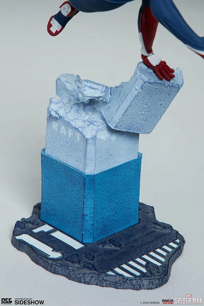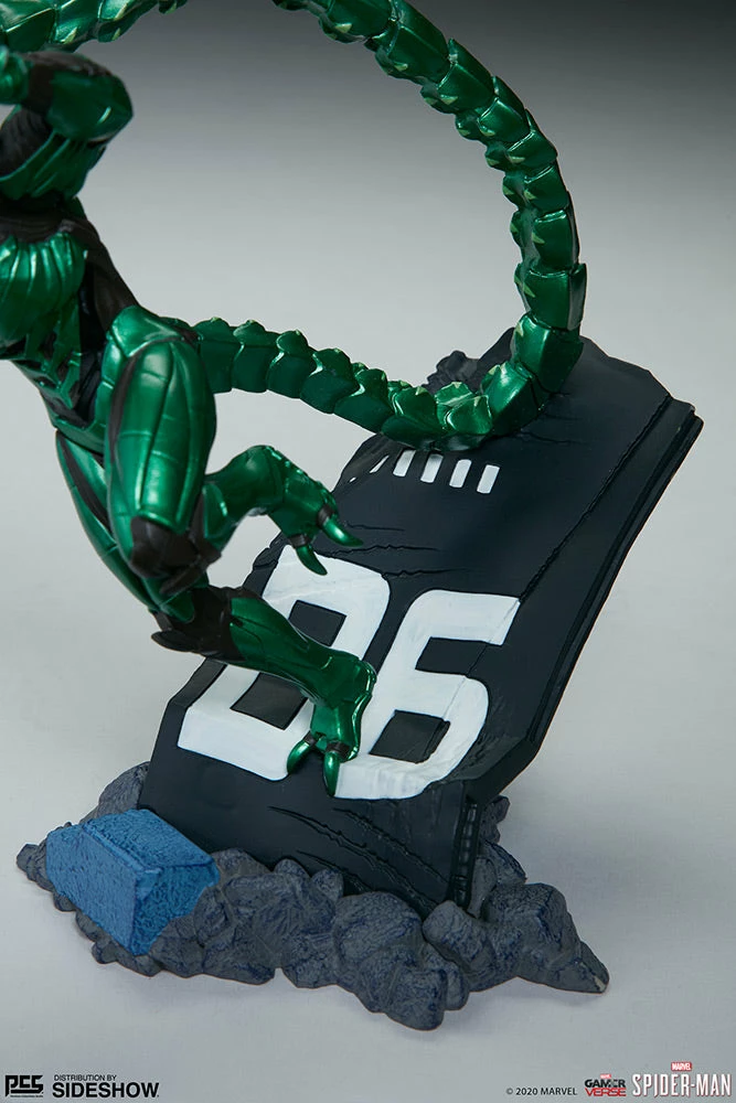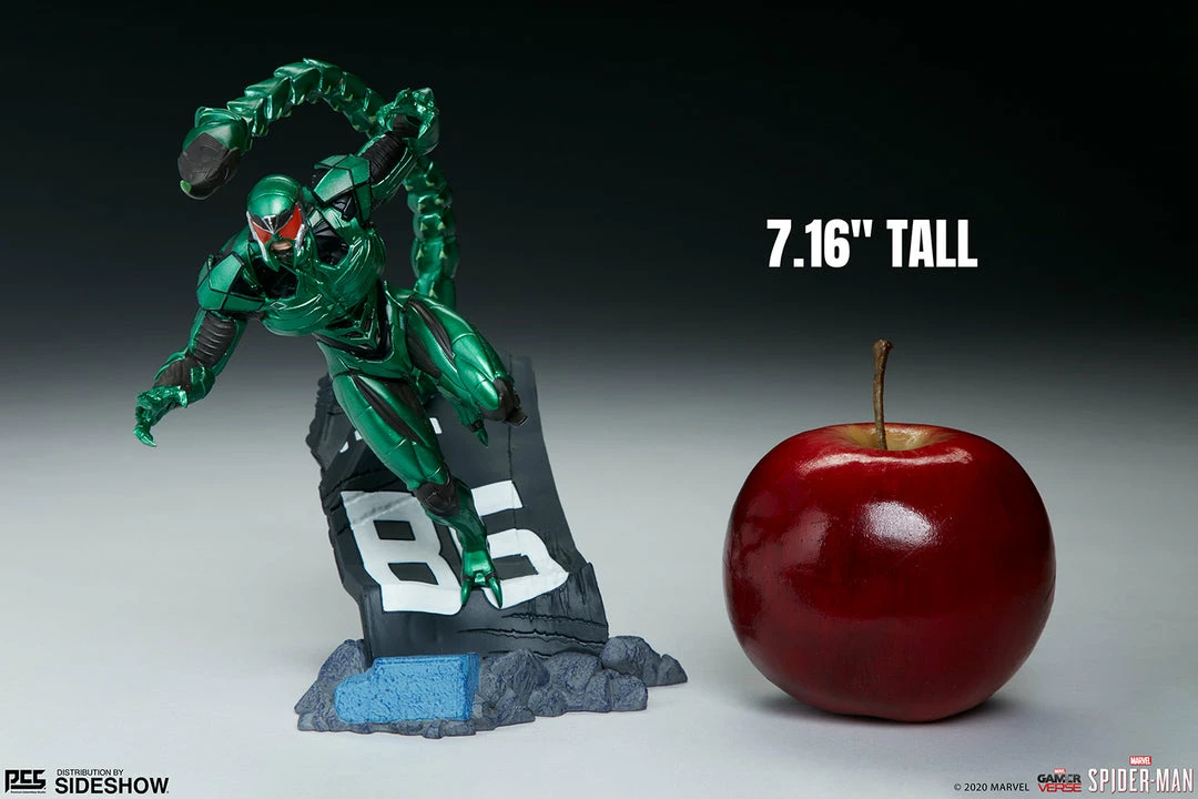 Spider-Man measures 6.86” tall as he vaults over a destroyed concrete column that reads “Raft”. Costumed in his now-iconic Advanced Suit, Peter Parker strikes a dynamic pose facing down two of the Sinister Six.