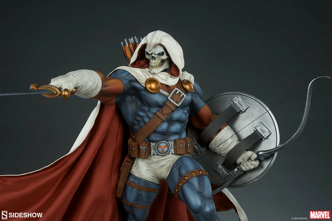 The polyresin Taskmaster Premium Format™ Figure features a mixed media costume with faithful callbacks to his earliest appearance as well as modernized elements. Taskmaster wears a wired, posable fabric cape and hood with a white textured exterior, red inner lining, and weathering details. The rest of his blue, orange, and white costume is sculpted and includes his bodysuit, belts, gloves, and boots to complete his striking look. Taskmaster’s shield and belt buckle are emblazoned with his signature ‘T’ shaped logo, and his menacing skull mask portrait gives this master combatant an ominous appearance.