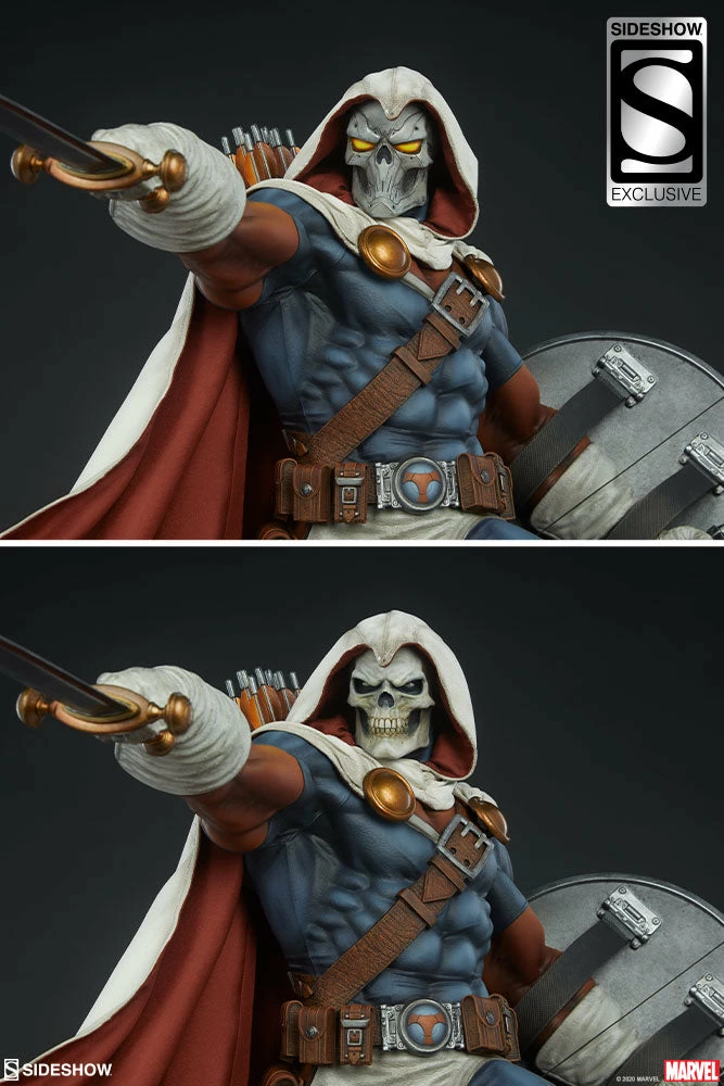The Exclusive Edition of the Taskmaster Premium Format™ Figure includes an alternate tactical mask portrait, which swaps this supervillain’s traditional skull face for a more modern armored look.