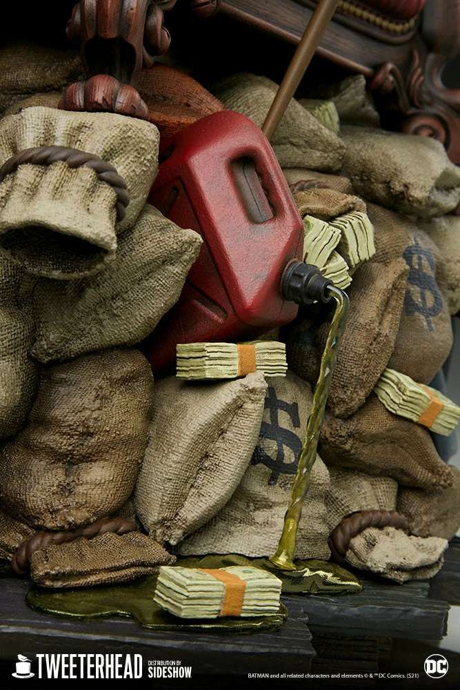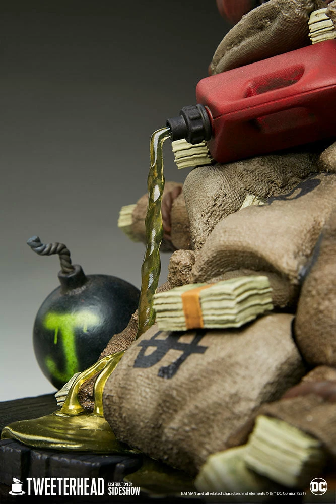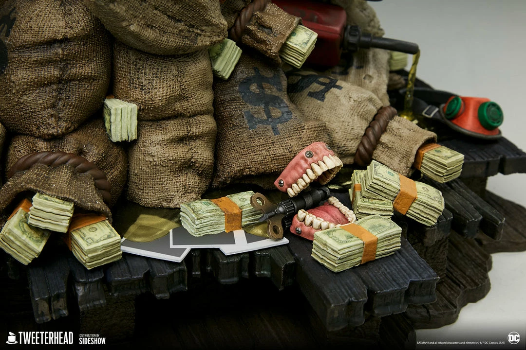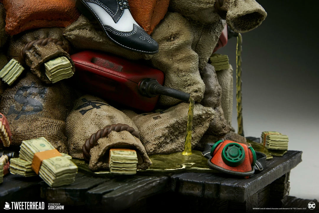 The Joker Deluxe Maquette measures close to 20.5β tall when fully assembled – from theΒ bottom of base to the tippy top of the Batmanβs cowl on the chair. This fully sculpted polyresin statue comes crammed with a bunch of craziness – Joker sitting atop his personalized throne with a Bat-cowl and cape, armed with his cane and bladed shoe. All nested on a giant pile of money bags, gasoline tanks, bombs, and endless knick-knacks and easter eggs, youβll probably never stop finding something new to love in this piece.