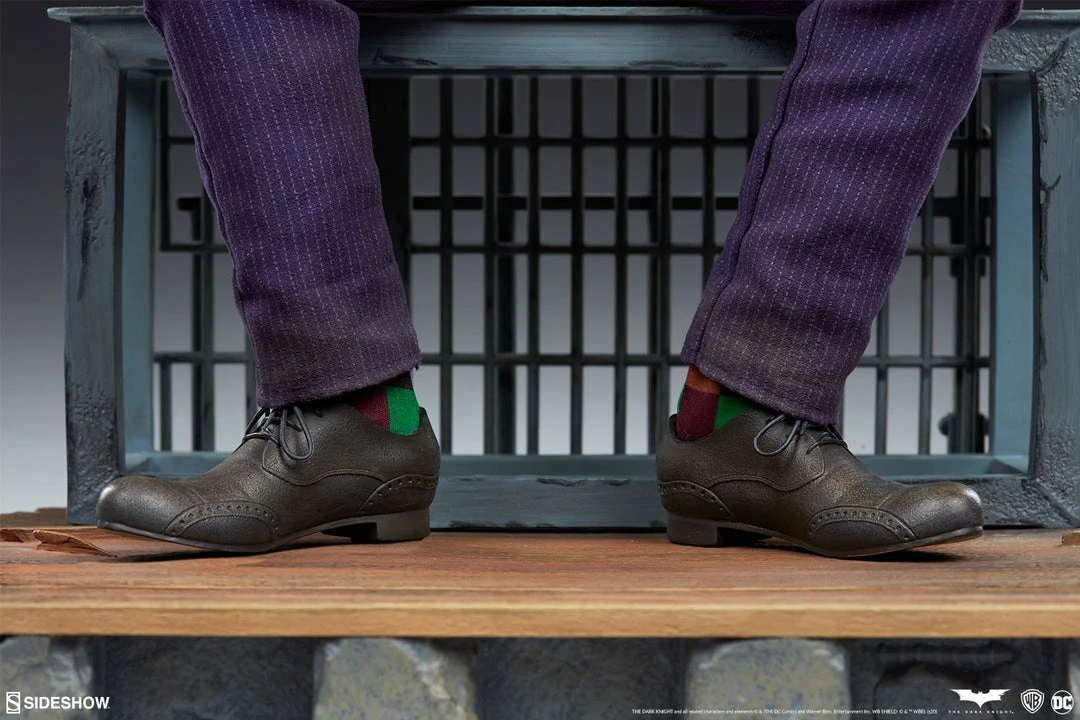 The polystone Joker Premium Format⢠Figure includes a fully fabric, custom-tailored costume recreating Ledgerās signature style from The Dark Knight. The dapper and dramatic villain is suited in a green vest over a blue hexagon-patterned dress shirt, along with a green patterned necktie, purple pinstriped pants, and even a pair of multi-colored socks. The clownish killer sits biding his time with an unnerving smirk on his face, his portrait carefully sculpted in Ledgerās likeness down to the worn-in application of makeup and scars of his Glasgow smile.